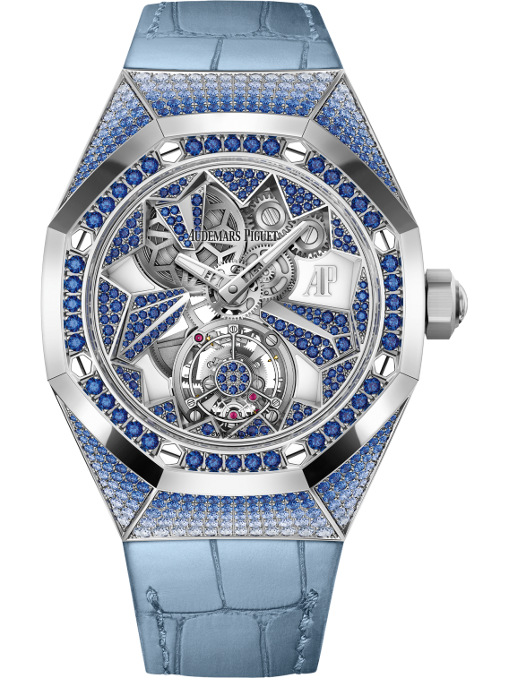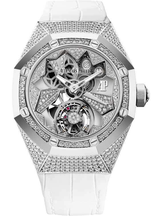 Dial: Openworked white gold or pink gold dial with crystals, Openworked white gold dial and bezel set with baguette-cut crystals.