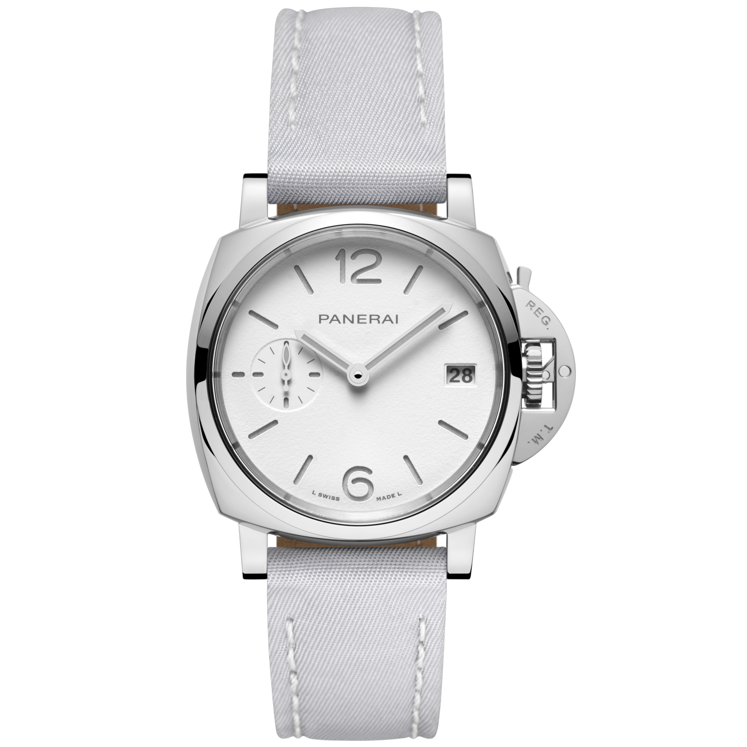 Dial: White with luminous Arabic numerals and hour markers. Date at 3 o’clock and small seconds at 9 o’clock.