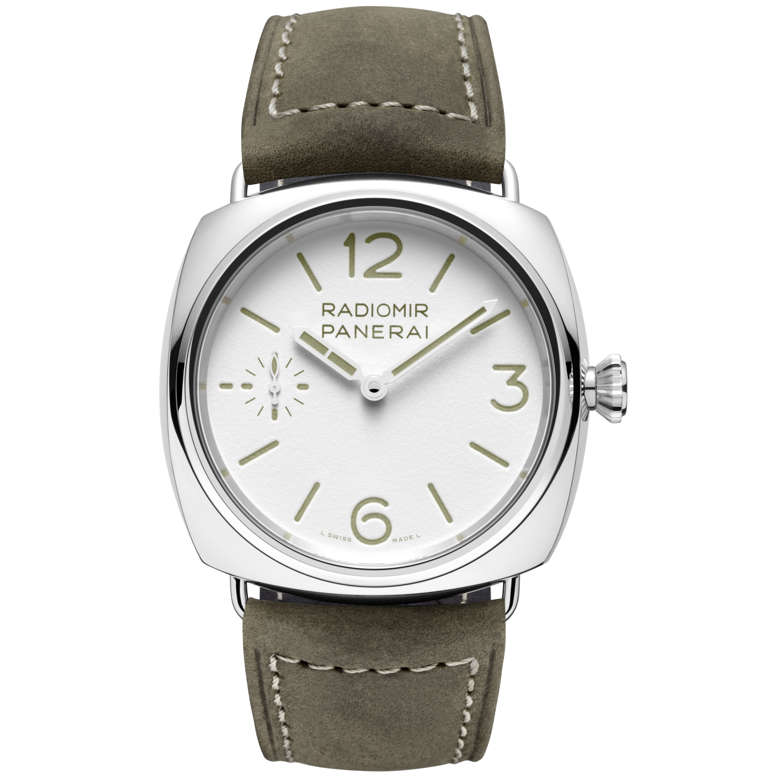 Dial: White grainy with luminous Arabic numerals and hour markers. with luminous Arabic numerals and hour markers. Small seconds at 9 o’clock.