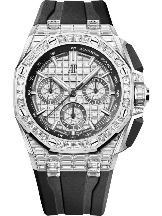 Bracelet: Black calfskin strap with yellow stitchings, Blue calfskin strap, Black alligator strap, Grey rubber strap, Grey calfskin strap, Light brown rubber strap, Blue rubber strap, White gold bracelet set with brilliant-cut crystals, Black rubber strap or White gold bracelet set with baguette-cut crystal.
