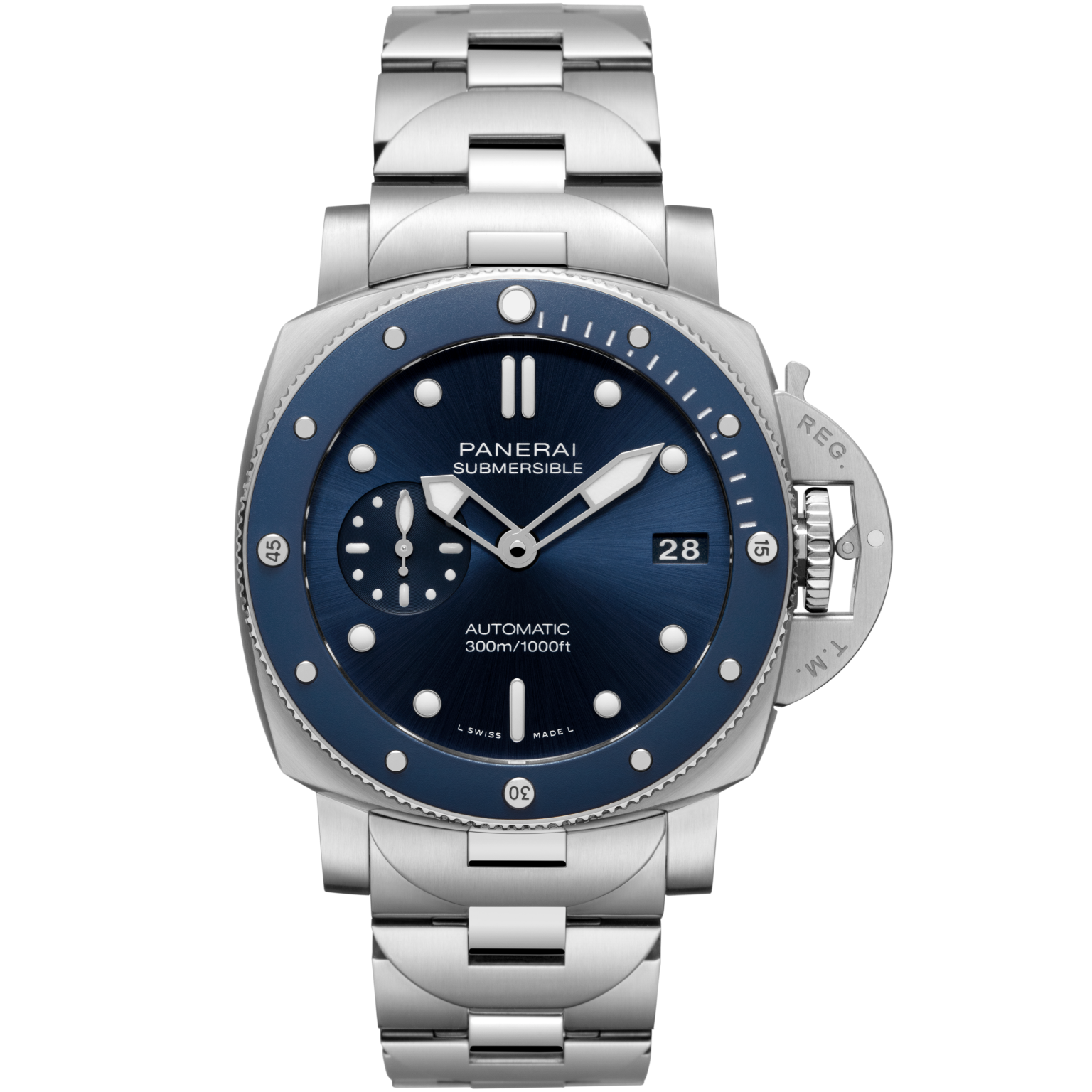Dial: Blue sun-brushed with luminous hour markers and dots. Date at 3 o’clock, small seconds at 9 o’clock.