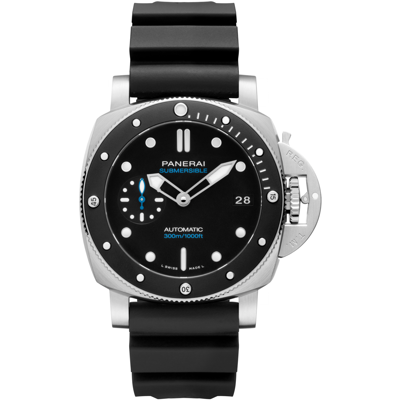 Dial: Black with luminous hour markers and dots. Date at 3 o’clock, small seconds at 9 o’clock.