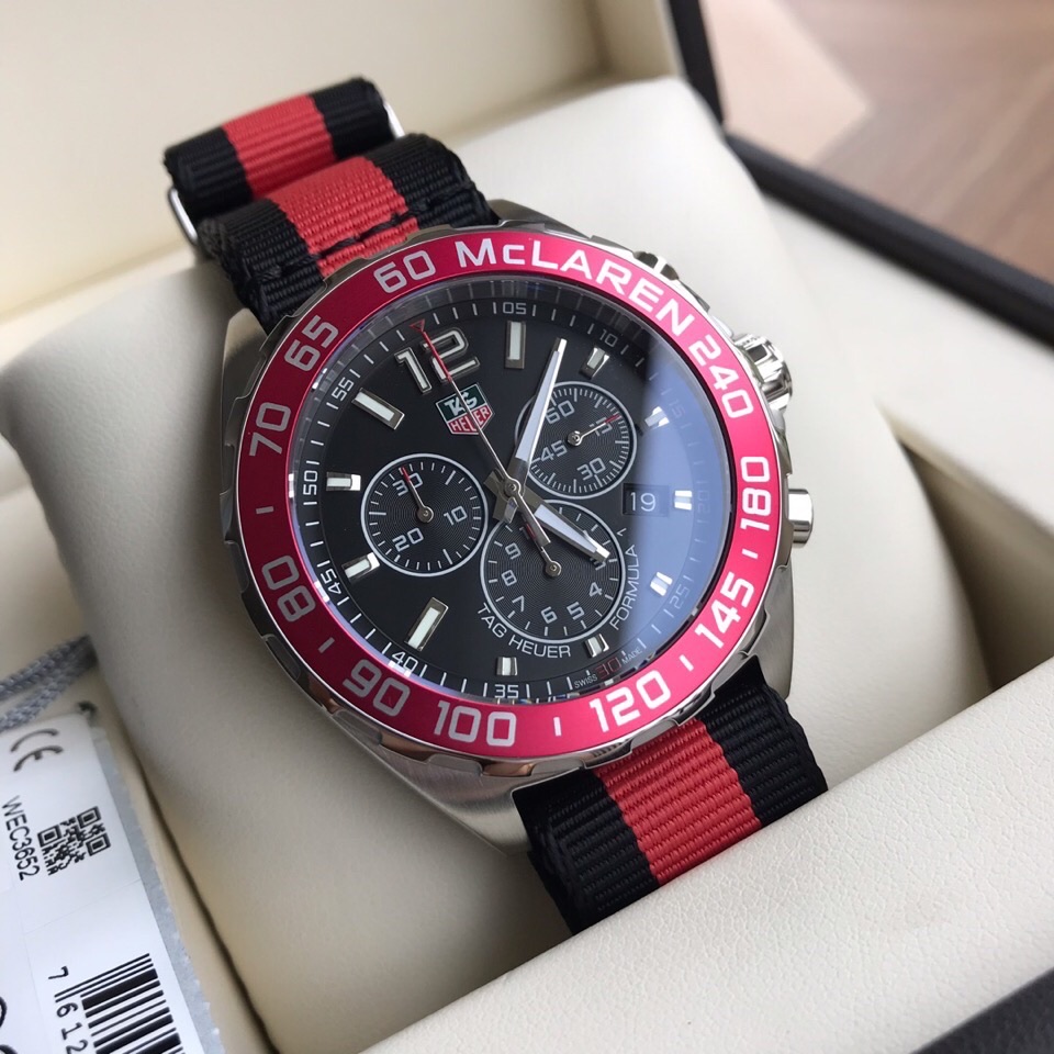 New TAG Heuer high-value new online, solid goods. Original Tagheuer, TAG Heuer F1 series rocket red limited edition. Handsome nylon strap men’s watch! Sapphire mirror, bezel engraved with McLaren and speedometer scale, the case back commemorates the partnership between TAG Heuer and McLaren in an unusual way: engraved with a side view of a 1985 MP4 racing car, and hot stamped with “TAG Heuer”. Original movement, support disassembly inspection, ~42mm watch diameter. One watch, one code, with a tag, brand new complete set