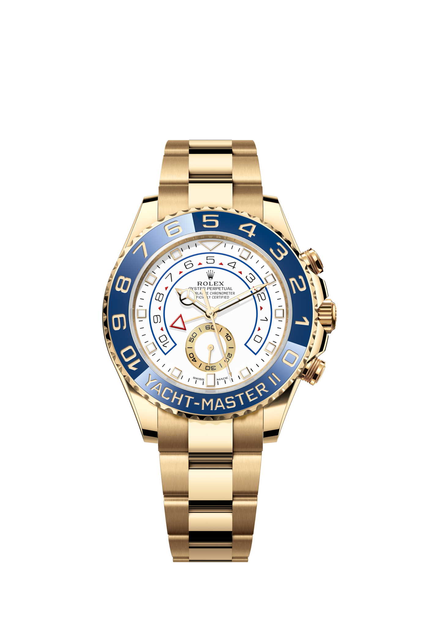 Bezel : Rolex Ring Command (bidirectional 90° rotatable interacting with the movement) in 18 kt gold with blue Cerachrom insert in ceramic and numerals coated in gold